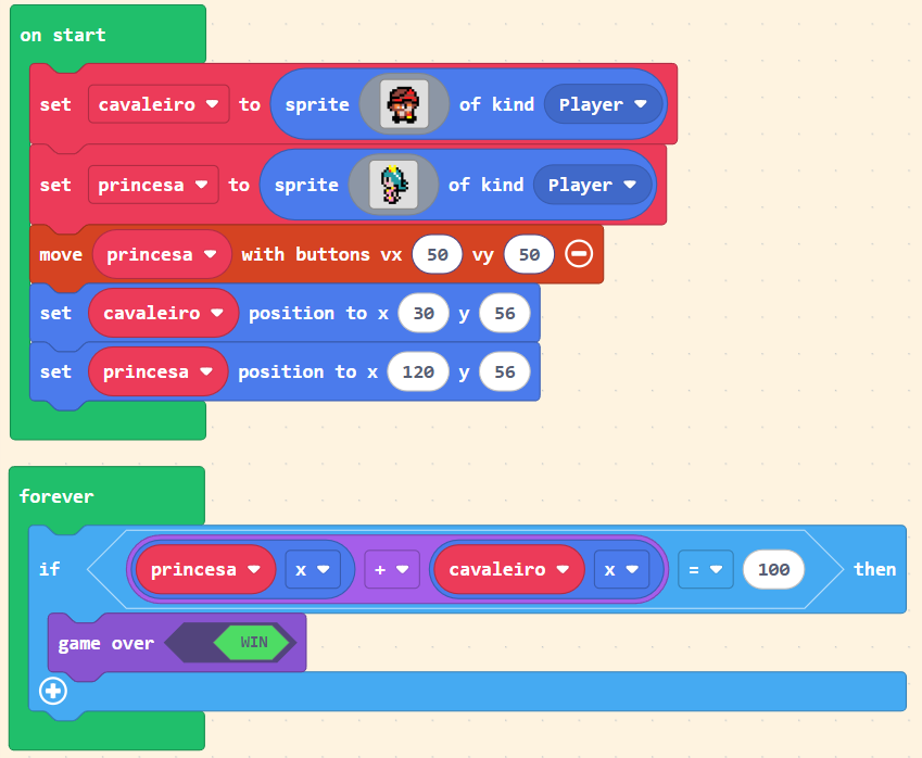 No programa abaixo a princesa não está falando quando apertamos o botão A. Ela não deve poder falar a qualquer momento também; apenas se o cavaleiro tiver passado da metade da tela.